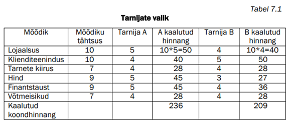 Tarnijad on partnerid, kes on eelkõige seotud ettevõtte ostujuhtimise protsessidega. Tarnijate kui partnerite tähtsuse määratlemisel kasutatakse levinuima töövahendina olulisuse hindamise maatriksit. Selleks määratletakse kriteeriumid, mida võimalike tarnijate hindamisel vaadeldakse. Seejärel hinnatakse kõikidele kriteeriumite tähtsust (tavaliselt kasutatakse skaalat 1-10) ja siis erinevaid tarnijaid nende kriteeriumite lõikes (nt 5pallisel skaalal). Lõpuks arvutatakse välja iga tarnija kaalutud tähtsus. Maatriksi näitena vaatame tabelis 7.1 kahte bürootarvete tarnijat Peetri Ehitusele.